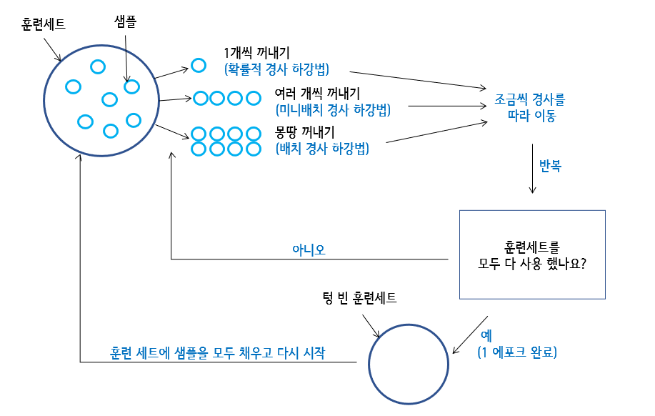 - 미니배치 경사 하강법 : 여러개의 샘플을 사용해 경사하강법을 수행하는 방식
