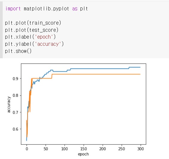 - 그래프를 그려본 결과 데이터가 작아서 잘 드러나지 않지만, 백번째 에포크 이후에는 훈련 세트와 테스트 세트 사이의 점수차이가 더 벌어지는 것을 확인할 수가 있다. 이런 식으로 그래프, 혹은 둘의 차이를 이용해 최적화된 에포크 횟수를 구할 수 있을 것이다.