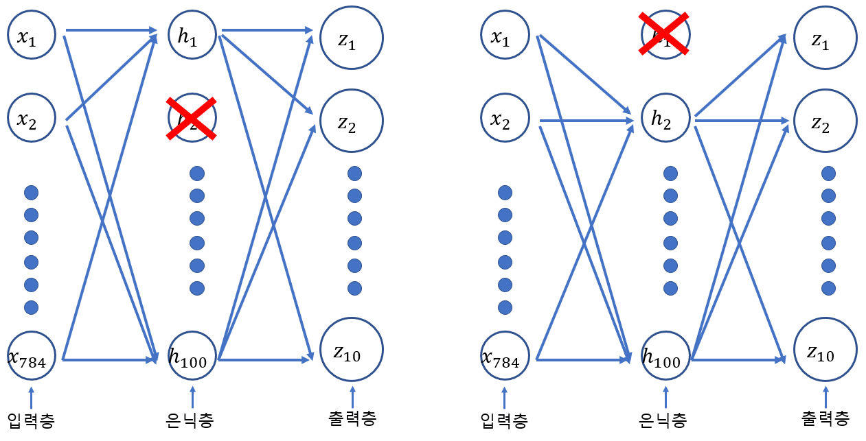 - 훈련과정에서 층에 있는 일부 뉴런을 랜덤하게 꺼서 과대적합을 막는 방법