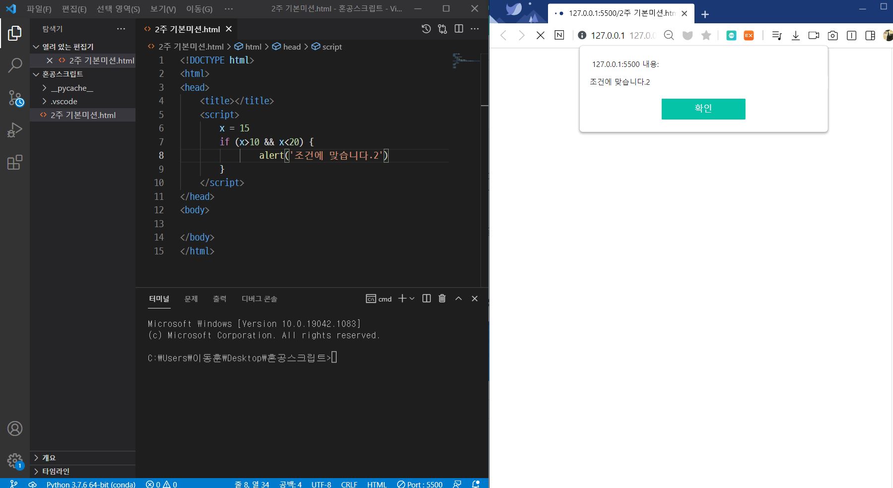 2. 기본 미션 : p.139 확인문제 3번 풀고 완전한 코드 만들어 비주얼 스튜디오 코드에서 실행결과 인증샷