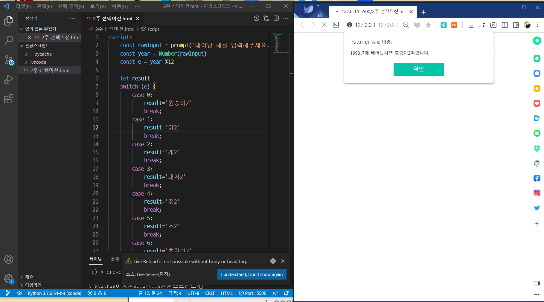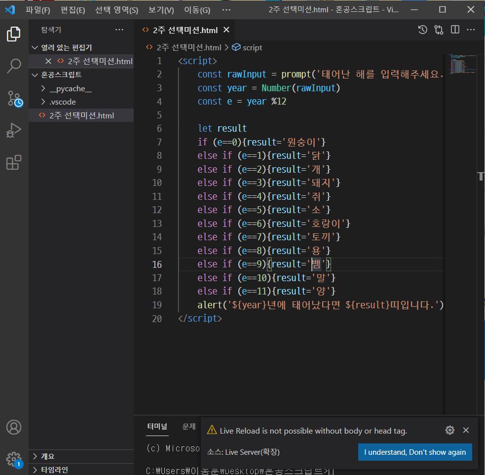 3. 선택미션 : p.152의 <태어난 연도를 입력받아 띠 출력하기> 예제 실행하여 본인의 띠 출력한 인증샷