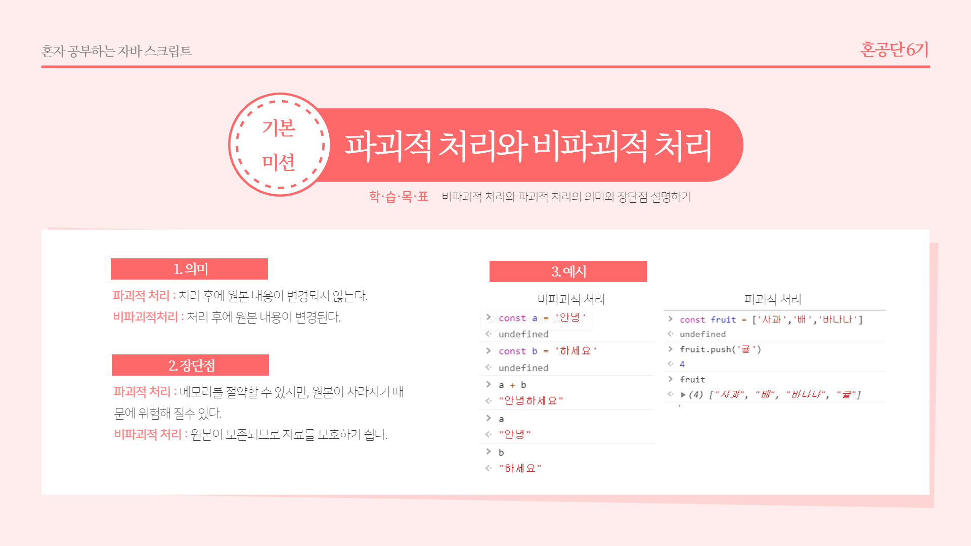 기본미션은 비파괴적 처리와 파괴적 처리의 의미와 장단점 설명하기입니다. 용어 자체는 처음 듣는 것 같아 낯설었지만, 정의나 장단점, 예시에 대해서는 예전에 한번 공부한 기억이 있어서 금방 이해를 했습니다.