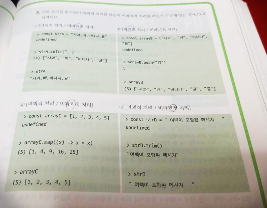 선택미션은 p.173 확인문제 3번 문제 풀고 인증샷입니다. 선택미션도 기본미션과 비슷하게 파괴적/비파괴적 처리에 관한 문제더군요. 간단히 풀이를 해보면 첫번째만 처음 변수가 함수를 실행한 후의 결과와 달라지므로 파괴적이고, 나머지는 원본이 바뀌지 않았으므로 비파괴적입니다.