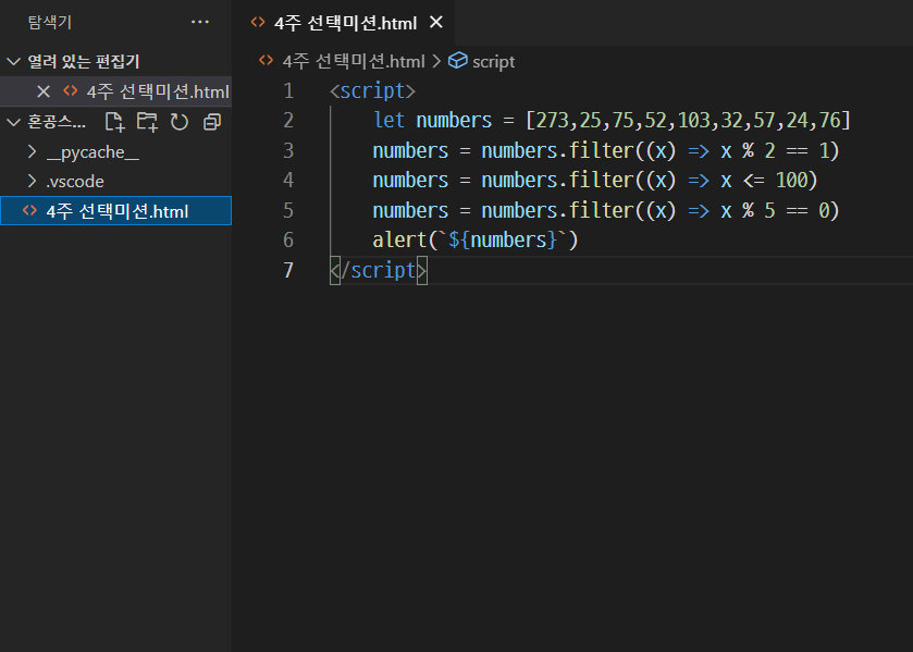 선택미션은 p.240 확인문제 1번 풀고 인증샷입니다. 선택미션은 filter 함수를 활용하는 문제인데, 문제의 설명에 적힌 번호순서대로 하나씩 조건을 완성하면 풀리는 문제였습니다.