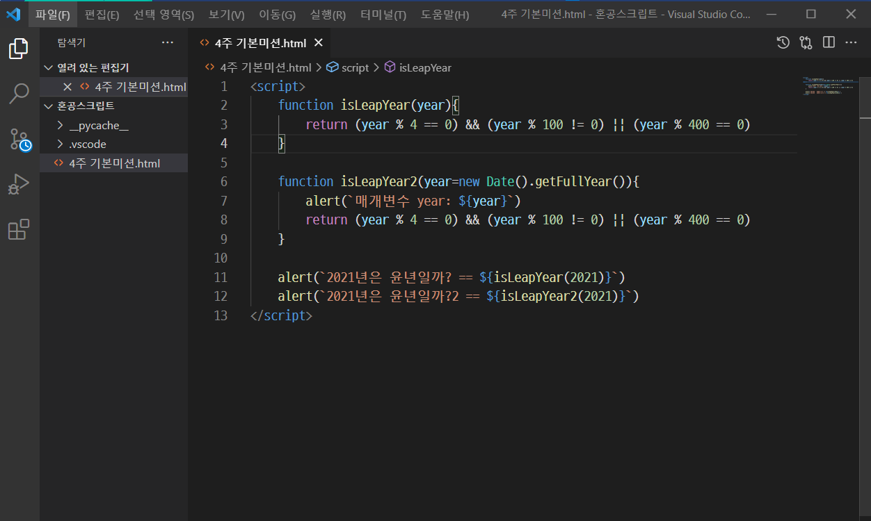 기본미션은 202쪽의 <윤년을 확인하는 함수 만들기> 예제를 실행하여 2021년이 윤년인지 확인하는 결과 인증샷입니다. 원래 202쪽에는 isLeapYear만 있었지만, 213쪽에 있는 예재도 같은 코드를 쓰고 있어서 같이 예재로 입력해서 실습을 진행해 보았습니다.