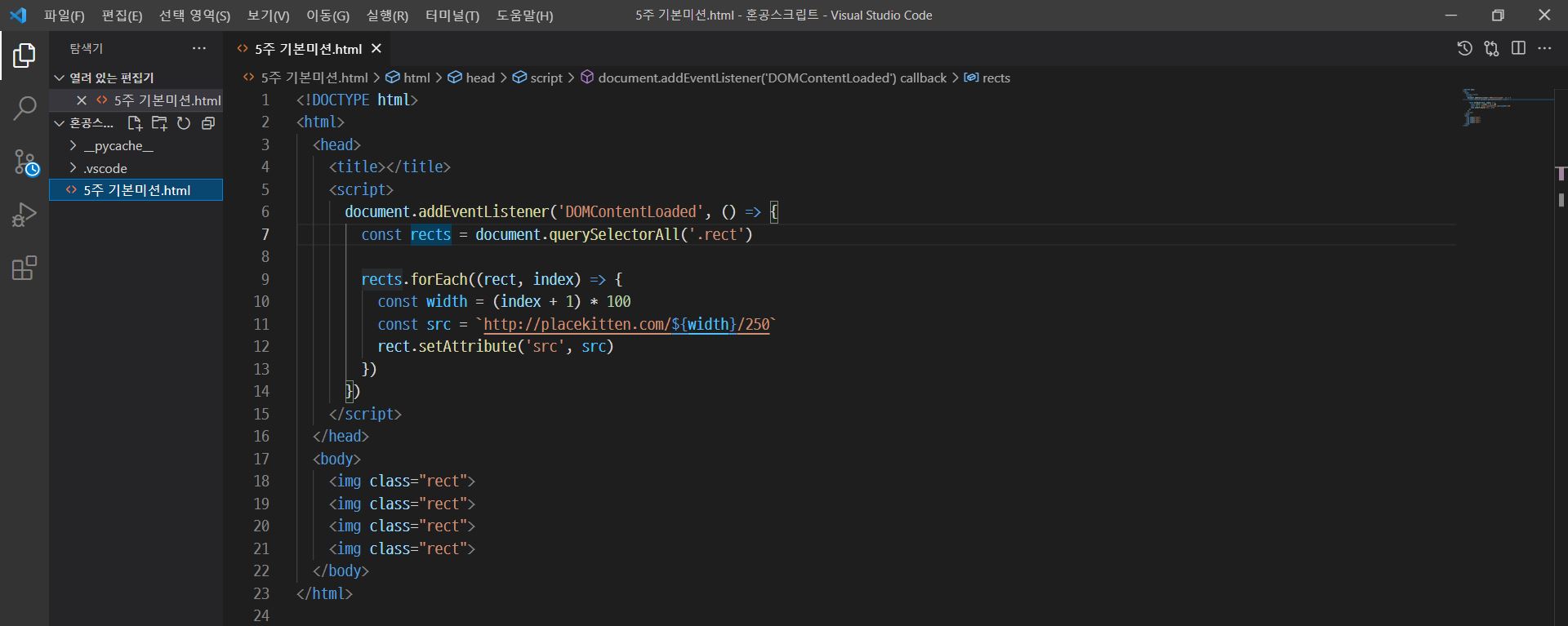 기본미션은 p.315의 <직접 해보는 손코딩>을 실행한 후 출력되는 고양이 이미지 인증샷입니다. 속성을 조작하는 방법에 대해서 시험을 해볼 수있는 예제인데요.