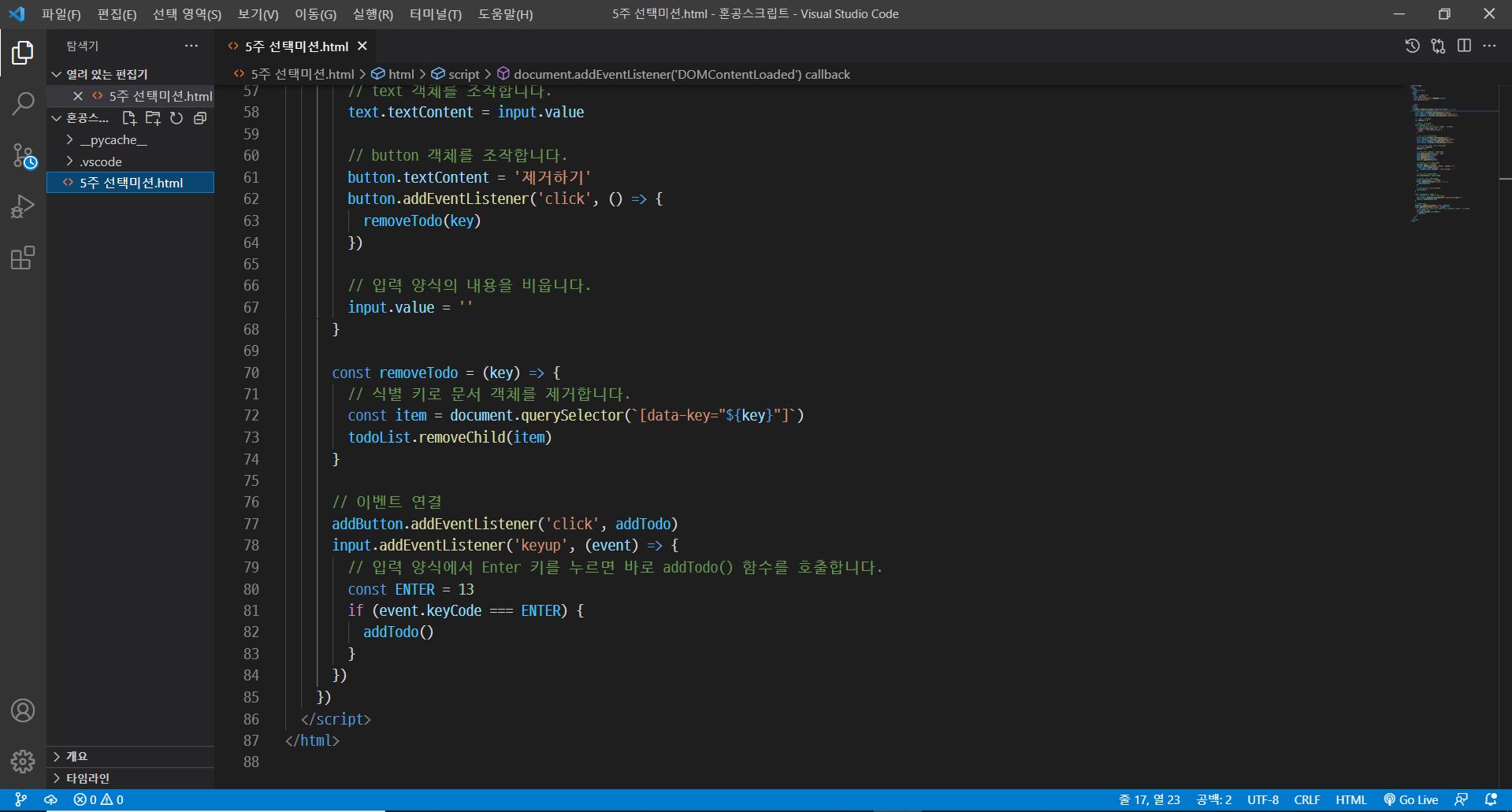 저번주엔 자바스크립트만의 문법적인 특징이 도드라지는 내용이 무척 많아 힘들었는데, 이번에는 저번주보다는 조금 나았던 것 같았습니다. 아무래도 힘든 산을 넘어서이기도 하고, 다른 문법이랑 겹치는 부분이 많다보니 조금은 빠르게 작성할 수 있지 않았나 싶네요.
