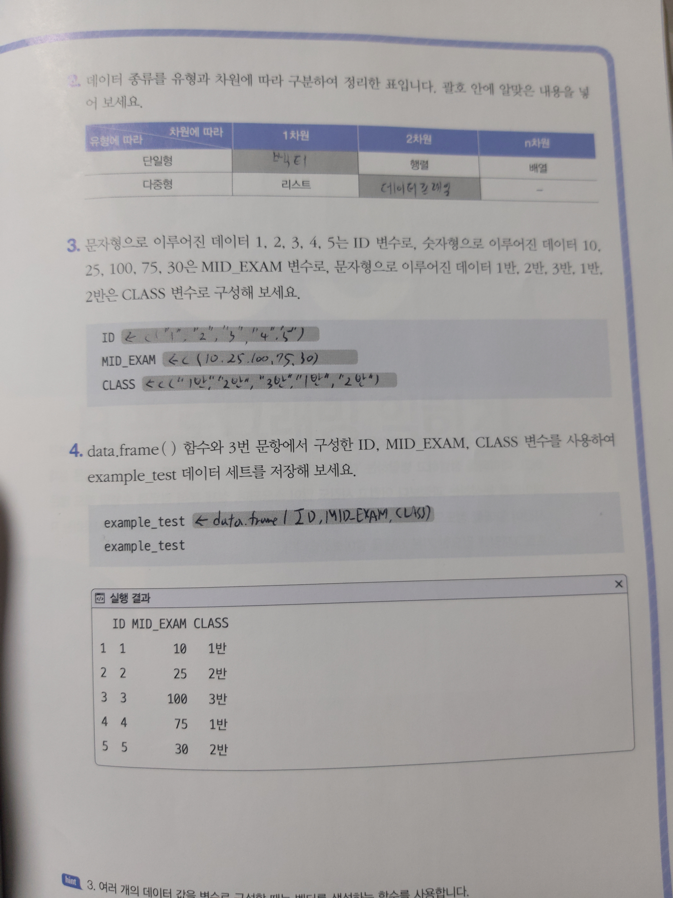 기본미션은 p.99의 확인문제 3,4번 풀고 인증샷 입니다. 99p의 3,4번 문제의 경우 데이터프레임을 만드는 문제였는데요. 주어진 자료들을 벡터로 넣고 변환하는 과정만 문제없이 한다면 풀수 있는 문제였습니다. 숫자형과 문자형만 유의해서 ㅗ본다면 앞의 예시코드를 활용해 쉽게 풀수 있을것 같았습니다.