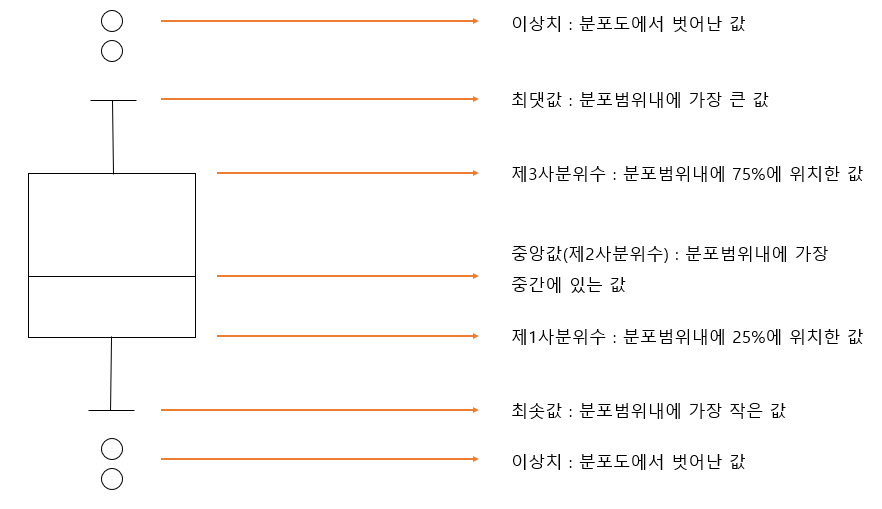 - 상자그림은 다음 그림과 같이 극단값(최댓값과 최솟값), 제3사분위수, 평균값, 중앙값, 제1사분위수의 5가지 항목을 시각화한 요약정보를 제공한다.