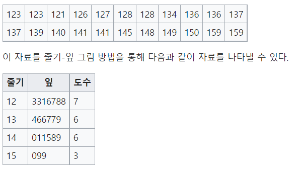 - 줄기 잎 그림 : 변수 값을 자릿수로 분류하여 시각화하는 방법