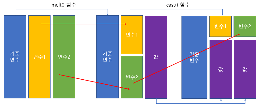 | acast() | 데이터의 행을 열로 바꾼다(벡터,행렬,배열로 반환) |