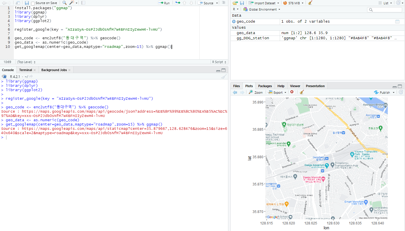 3. 선택미션 : 구글 API와 ggmap 패키지를 활용해서 원하는 장소의 지도를 불러온 후 결과 화면 인증샷