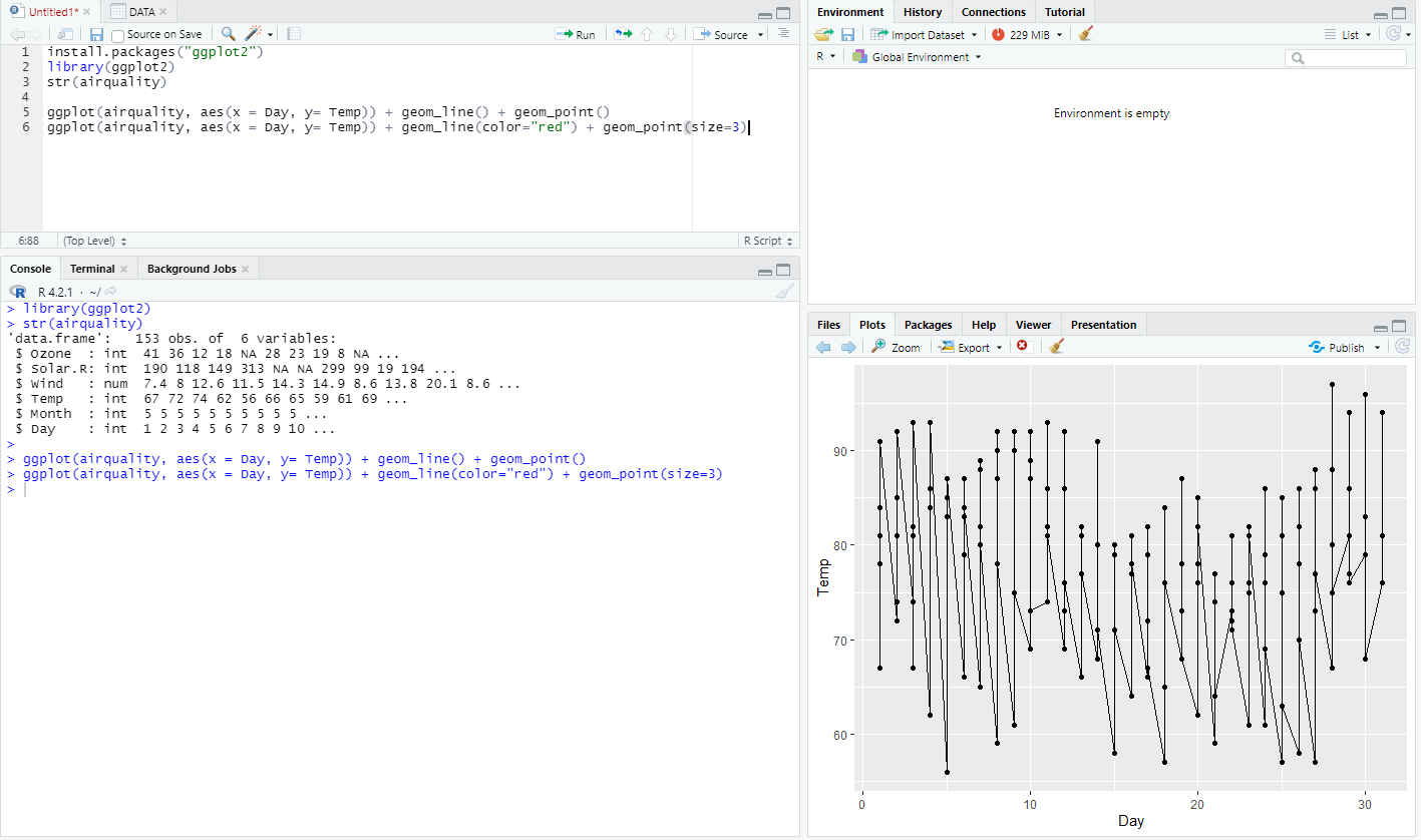 기본미션은 p.288의 <좀 더 알아보기>실습하고 결과 화면 인증샷입니다. p.288의 <좀 더 알아보기>의 경우 그래프에 그래프를 더하는 예재로, ggplot 만의 독특한 함수 사용법을 익힐 수있던 부분이었습니다. 지금 봐도 덧셈으로 펼치는 거는 신기하네요.